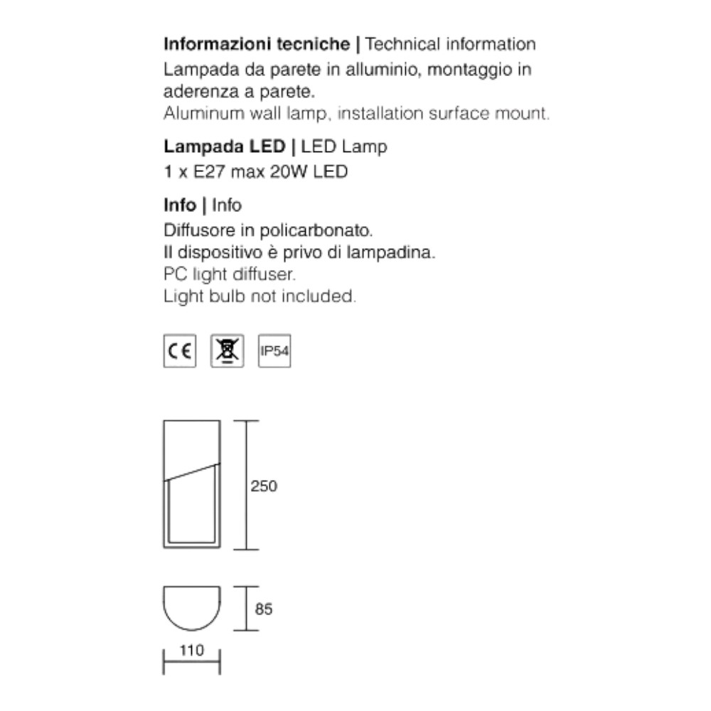 Realizzata in alluminio, questa applique combina robustezza e design contemporaneo con linee essenziali e geometriche. Il diffusore in policarbonato garantisce una distribuzione uniforme della luce, creando un’atmosfera accogliente e valorizzando l’ambiente circostante. Il grado di protezione IP54 assicura resistenza agli agenti atmosferici, rendendola adatta all’utilizzo in spazi esterni esposti.