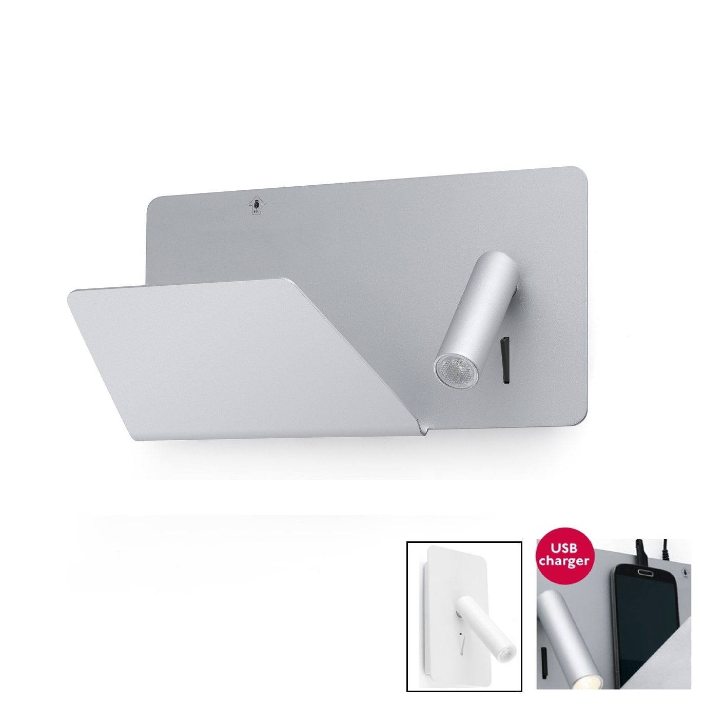 Applique grigio sinistro per camera da letto orientabile con mensola presa usb