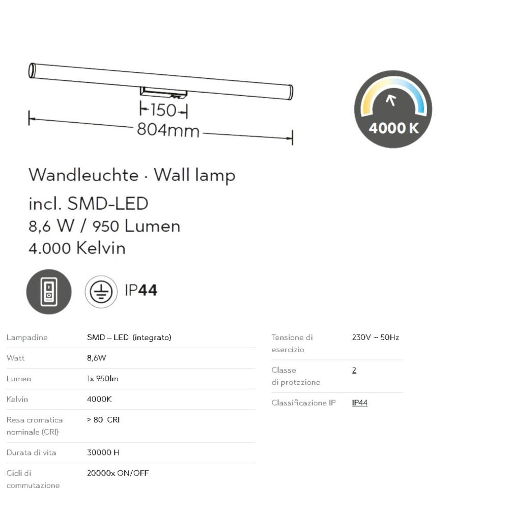 Dal profilo sottile e dalla linea moderna, questa applique si distingue per la sua estetica sobria ed elegante, perfetta per valorizzare l’ambiente bagno. La struttura cromata, abbinata al diffusore bianco satinato, si adatta con equilibrio a diversi stili d’arredo, fornendo una luce chiara e uniforme. Con una lunghezza di 80 cm, è ideale per l’installazione sopra lo specchio, assicurando un’illuminazione ottimale per la zona lavabo. Il grado di protezione IP44 ne consente l’uso sicuro in ambienti umidi. Il LED integrato da 8,6W emette una luce neutra da 4000K, perfetta per attività quotidiane come il trucco o la rasatura. Dotata anche di interruttore diretto sul corpo lampada per un'accensione rapida e funzionale.