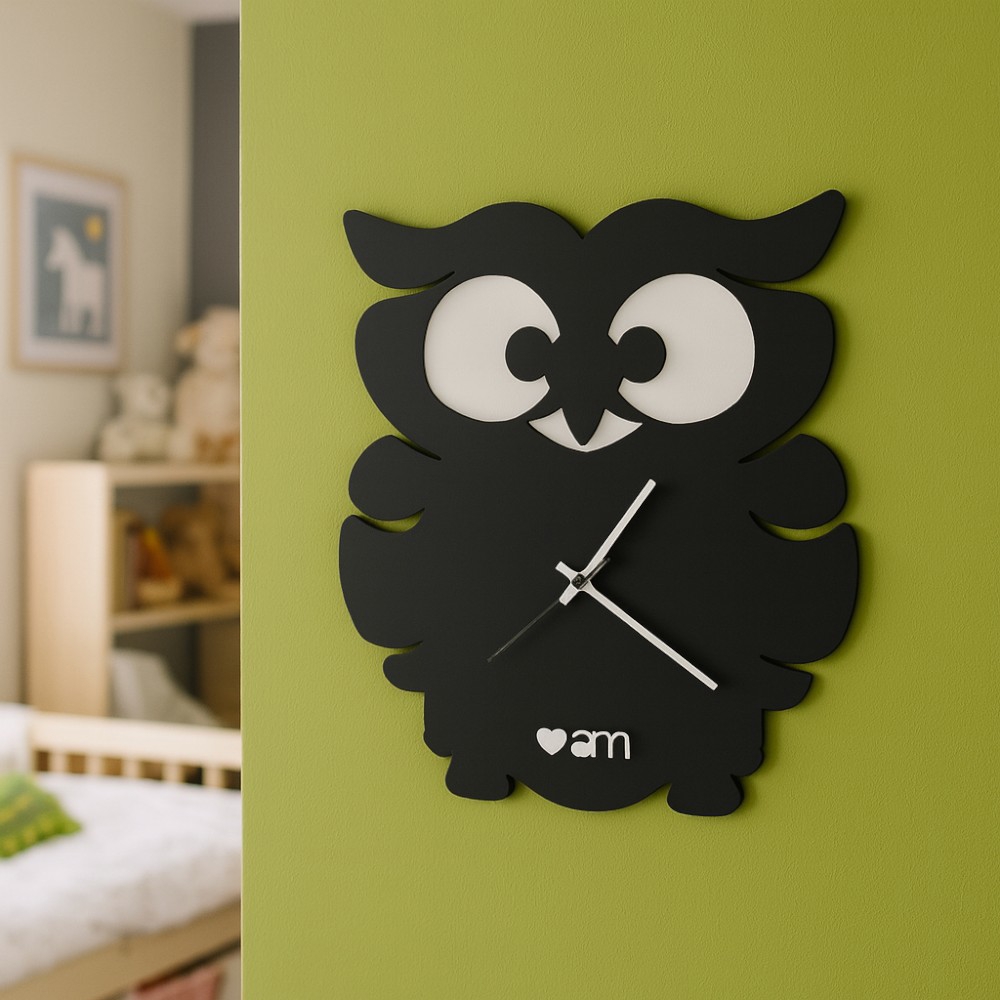 Questo orologio da parete moderno che raffigura un simpatico gufo in metallo nero, combinando design giocoso e Made in Italy. Perfetto per camerette, ma anche per cucine o uffici dal carattere creativo, è realizzato con taglio laser che valorizza i dettagli e dona leggerezza visiva. Il meccanismo è preciso, sebbene leggermente udibile, e l’installazione è semplice grazie ai supporti inclusi. Un orologio da parete particolare che porta un tocco di fantasia e originalità a qualsiasi spazio.