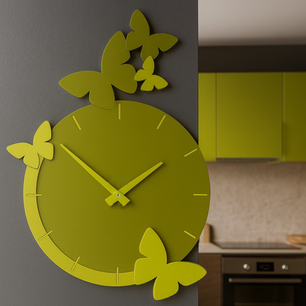 Un orologio da parete dal design originale e raffinato, perfetto per chi desidera un complemento d’arredo che unisca funzionalità ed estetica. Il modello Butterfly nella tonalità verde oliva, si distingue per la presenza di eleganti farfalle che sembrano prendere il volo, creando un effetto visivo dinamico e armonioso.