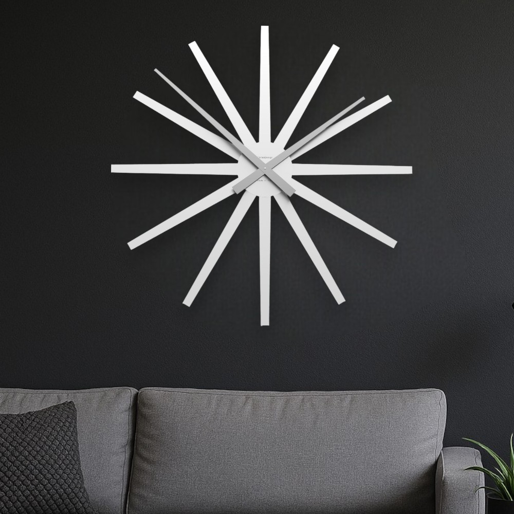 L'orologio da muro bianco della collezione Frizz è un'elegante espressione di design minimalista e artigianalità italiana. Composto da 12 elementi in MDF con vernici all'acqua satinate, si distingue per leggerezza visiva e impatto estetico. Il meccanismo tedesco silenzioso e preciso garantisce durata, mentre le lancette in metallo si armonizzano con il quadrante. Ideale per chi cerca un grande orologio da parete che valorizzi spazi ampi come soggiorni o locali commerciali.