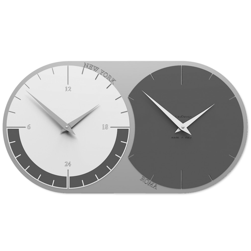 Un orologio da parete moderno che unisce estetica e funzionalità in un'unica soluzione raffinata. Il modello World Clock si distingue per la sua particolare forma ovale, ottenuta dall’unione di due quadranti rotondi, ciascuno impostabile su un diverso fuso orario, perfetto per chi ha contatti internazionali o semplicemente desidera un complemento d'arredo dallo stile cosmopolita.