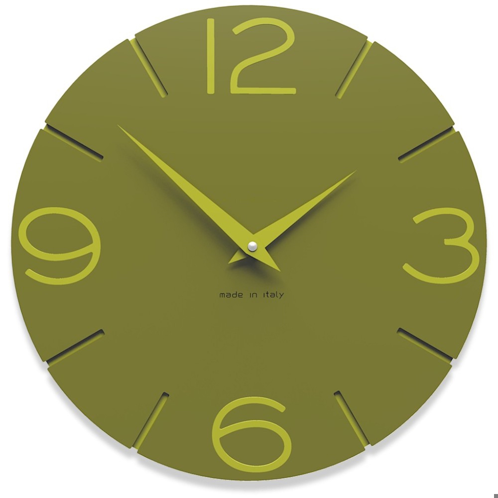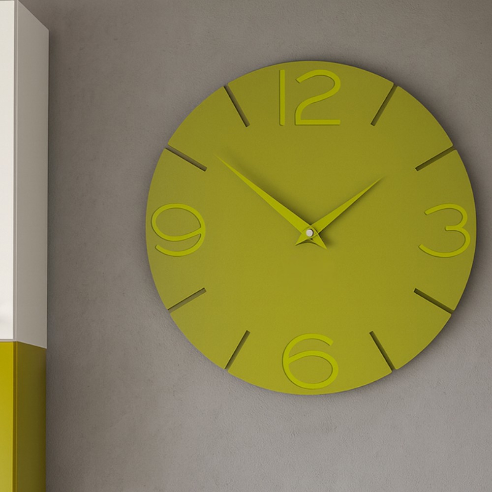 Orologio moderno da parete della nuova collezione, con forma rotonda e diametro di 30 cm, prodotto 100% Made in Italy. Realizzato in fibra di legno verniciato color verde oliva con finitura satinata, si distingue per il design elegante e minimale. Disponibile in 23 colorazioni, è perfetto per arredare con gusto cucina, soggiorno, studio o cameretta. Le lancette in metallo, verniciate in coordinato con il colore dell’orologio, completano un look armonioso e raffinato. Dotato di un meccanismo tedesco silenzioso e affidabile, rappresenta una soluzione pratica ed esteticamente piacevole. Include un tassello per il fissaggio e una batteria stilo AA Duracell.