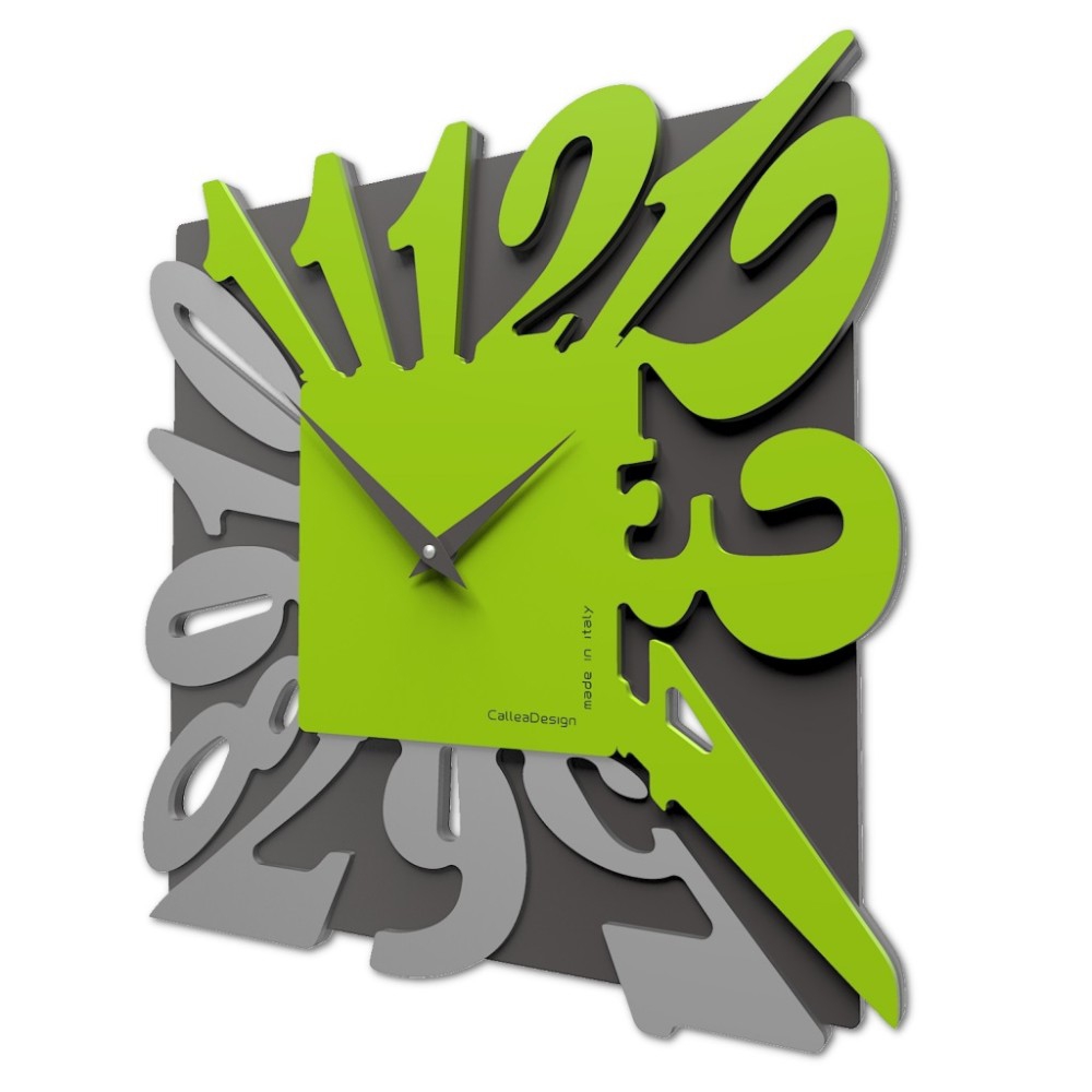 In questa versione di colore verde, l’orologio è realizzato interamente in MDF (fibra di legno), un materiale resistente e leggero. La base quadrata di 37x37 cm in grigio scuro è arricchita da due pannelli sovrapposti: il primo con numeri dal 5 al 10 in grigio chiaro, e il secondo con numeri dall’11 al 4 in verde. Tutti i numeri convergono verso il quadrante centrale, dove risaltano le lancette in metallo verniciate in grigio, creando un effetto visivo dinamico ed elegante.