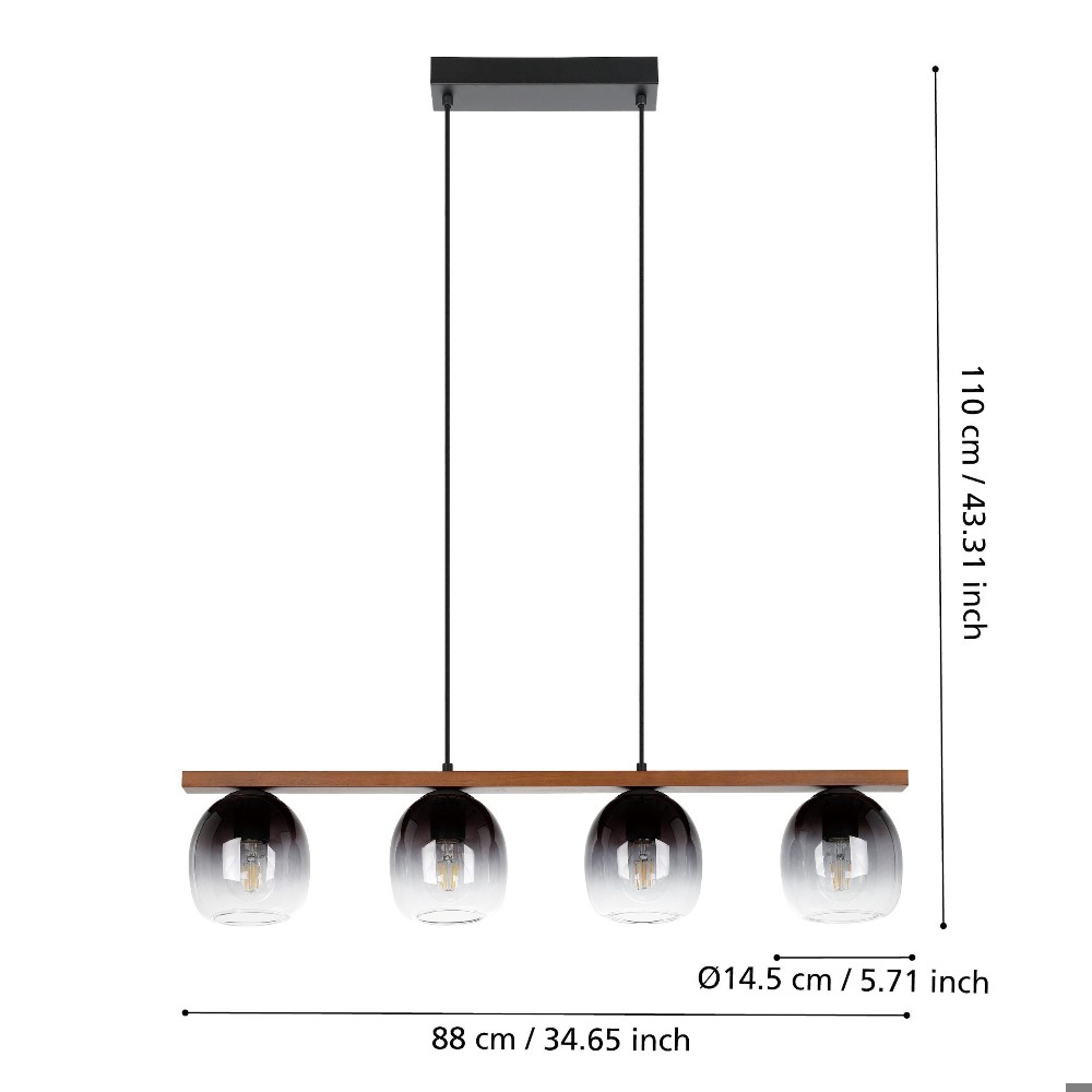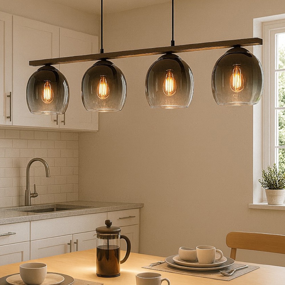 Questo lampadario da cucina unisce eleganza e funzionalità con un design moderno che valorizza l'ambiente. La barra in legno sostiene quattro diffusori in vetro dalla finitura sfumata nei toni nero, grigio e trasparente, creando un suggestivo gioco di luci e riflessi. La struttura in acciaio nero conferisce solidità e carattere, mentre i cavi regolabili fino a 110 cm lo rendono adatto per tavoli da pranzo o isole cucina. Compatibile con lampadine LED E27 fino a 20W ciascuna (non incluse), permette di personalizzare l'intensità luminosa secondo le esigenze.