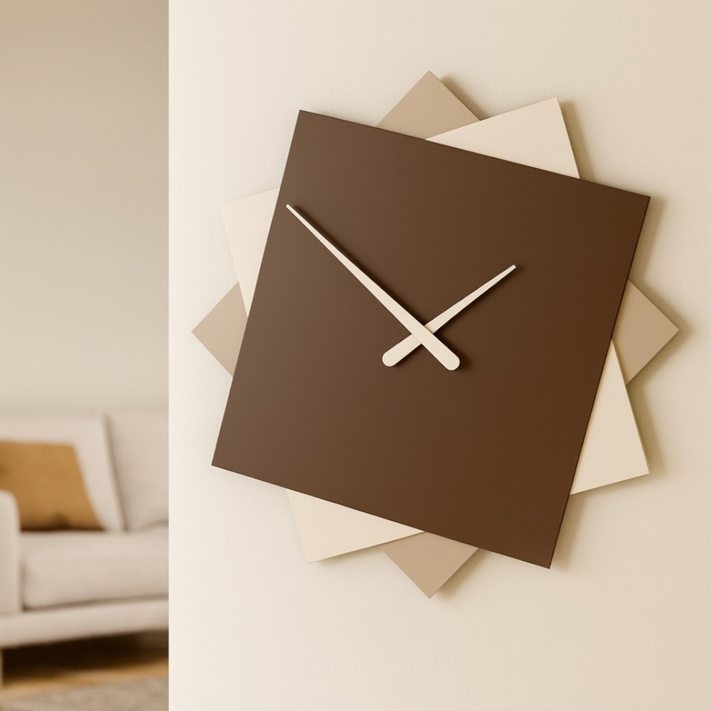 L'orologio da parete "Foy" è un complemento d’arredo sofisticato e di grande impatto visivo, perfetto per arricchire qualsiasi ambiente con un tocco di modernità. Caratterizzato da una struttura a tre livelli sfalsati, presenta una raffinata combinazione di tonalità marroni, con il cioccolato come colore dominante e dettagli in nuance più chiare che creano un contrasto armonioso. Le lancette in metallo tortora esaltano l’eleganza del design minimalista, in cui l’assenza di numeri rafforza la pulizia delle forme e l’essenzialità estetica.