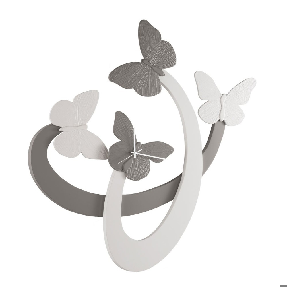 Con un diametro di 90 cm, questo grande orologio da parete moderno si distingue per la sua presenza scenica e per l’elegante motivo decorativo con farfalle bicolore che sembrano prendere vita sulla superficie. Realizzato in legno MDF con finitura bianca atossica e lavorazione in rilievo, è ideale per impreziosire pareti di soggiorni e camere da letto con un tocco poetico. Le lancette metalliche bianche si integrano con discrezione nel design. Un perfetto esempio di orologi da parete particolari, capaci di coniugare estetica, qualità e artigianalità italiana.