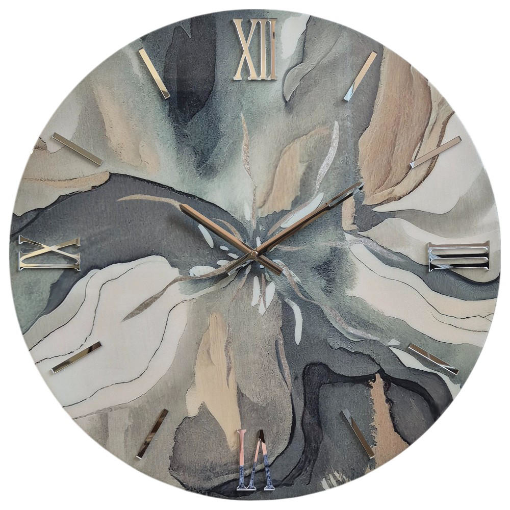 Grande orologio moderno da muro da 80 cm della collezione Nuanze, realizzato artigianalmente in Italia con estrema cura per ogni dettaglio. La superficie in legno è lavorata con una colata di resina epossidica resistente ai raggi UV, che protegge e valorizza un decoro materico ispirato a forme naturali, caratterizzato da sfumature neutre e pennellate fluide. Eleganti inserti in foglia argento applicati a mano donano luce e profondità alla composizione. Completano il design i numeri romani in plexiglass argento specchiato e le lancette in metallo cromato silver, per un effetto raffinato e contemporaneo. Funziona con batterie stilo non incluse.