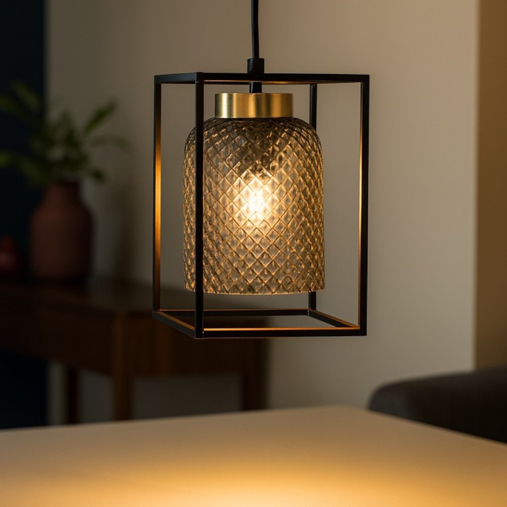Un lampadario a sospensione ideale per illuminare i comodini di una camera in stile contemporaneo, unendo eleganza e funzionalità. La struttura è composta da una gabbia quadrata in metallo nero con dettagli in oro, che conferiscono un tocco raffinato e moderno. Il vetro trasparente fumé, lavorato con cura, avvolge la lampadina, creando un’illuminazione suggestiva e personalizzabile. Grazie al portalampada E27, è possibile scegliere lampadine LED con il colore della luce, la potenza e la dimmerabilità desiderati. Il cavo regolabile permette di adattare l’altezza del diffusore, rendendolo versatile per qualsiasi esigenza di design.
