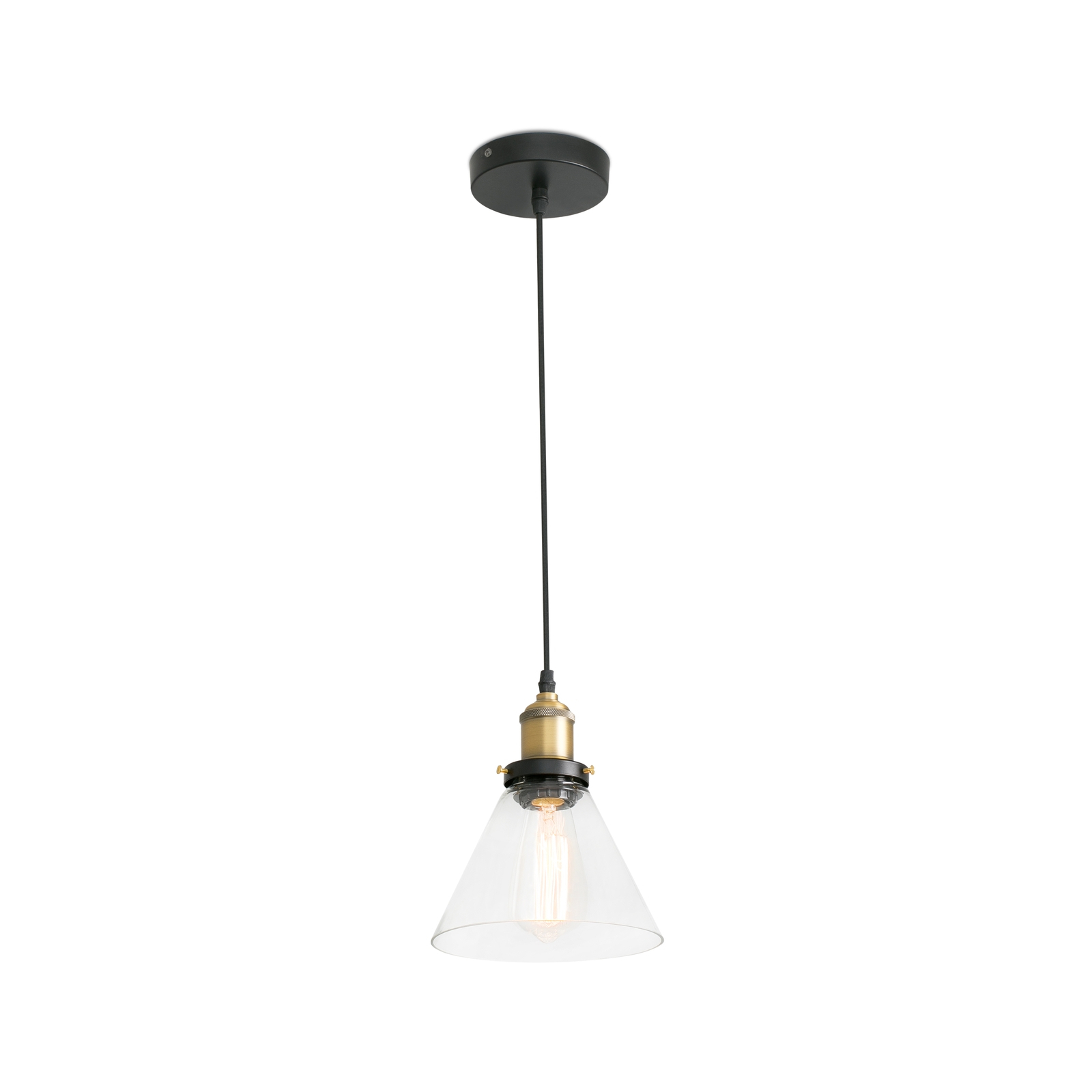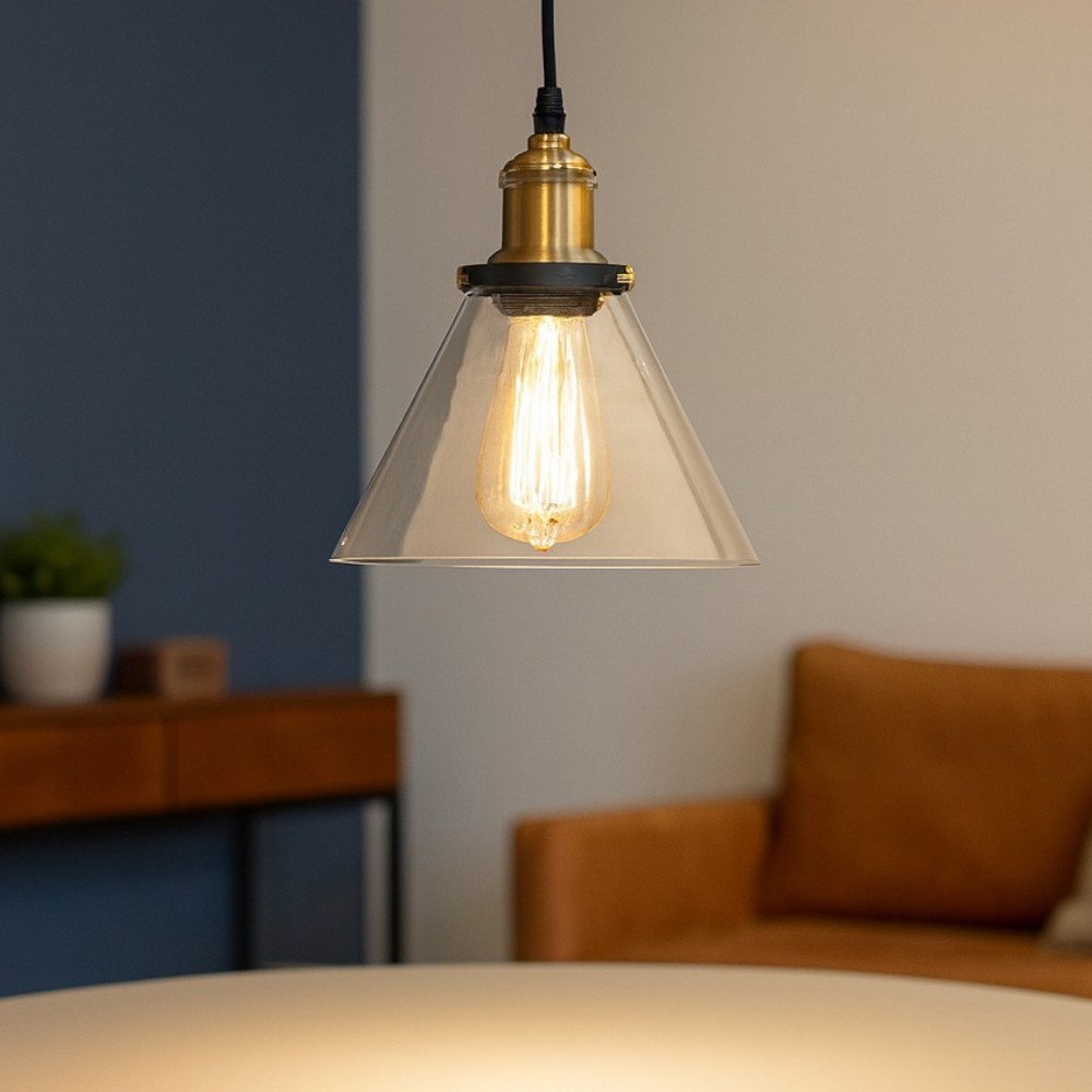 Perfetta per aggiungere un tocco vintage alla tua isola o al bancone, questa lampada a sospensione combina funzionalità e design retrò. Realizzata con una struttura in metallo dorato e nero e un elegante vetro trasparente a forma di cono, garantisce un'illuminazione a 360° uniforme e accogliente, ideale per ambienti domestici o contract come pub, ristoranti e bar. La compatibilità con lampadine LED a filamento E27 consente di personalizzare l’atmosfera con luce soffusa o intensa, a seconda delle necessità.
