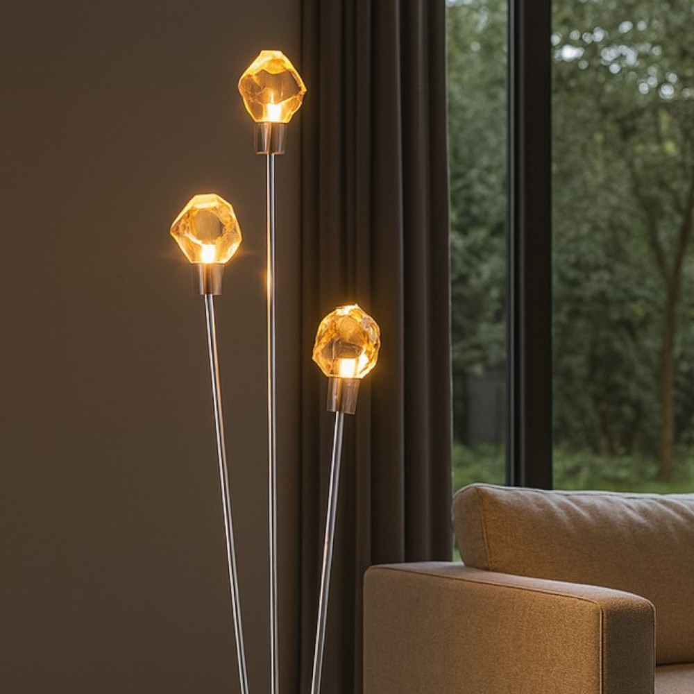 Eleganza scultorea e brillantezza decorativa si fondono in questa lampada da terra a tre luci, dove steli metallici cromati si slanciano verso l'alto terminando in raffinati diffusori in cristallo trasparente. Il design slanciato e simmetrico ne fa un elemento d'accento ideale per salotti moderni, ingressi di rappresentanza o camere da letto sofisticate. Il dimmer touch integrato consente una regolazione fluida dell'intensità luminosa e permette di selezionare tra tre temperature di colore – 2300K, 3000K o 4000K – creando ambienti su misura, dal più rilassante al più dinamico. Grazie ai LED ad alta efficienza, la lampada garantisce un'emissione totale di 2400 lumen, mantenendo consumi ridotti e una durata fino a 30.000 ore.