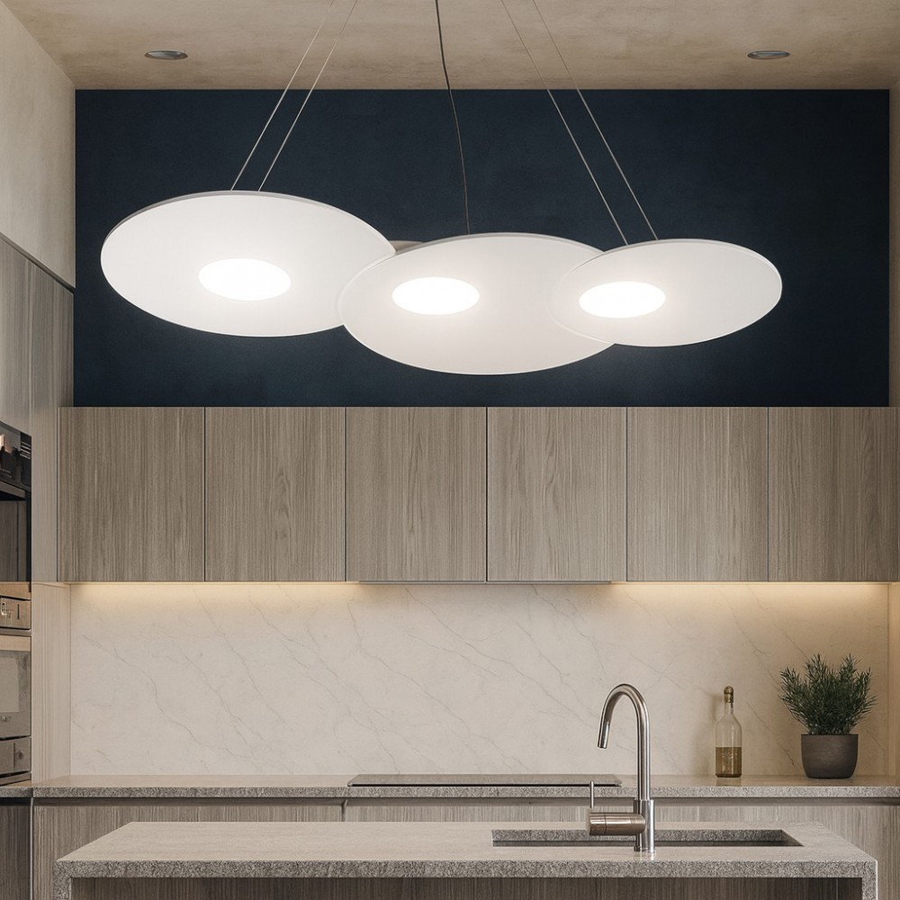 Un'elegante fusione di design e funzionalità caratterizza questo lampadario da cucina della serie Cloud di Top Light. Il modello a 3 luci, con lampadine LED intercambiabili, si distingue per la sua forma ispirata a una nuvola sospesa, perfetta per illuminare una cucina moderna con stile. Realizzato in metallo bianco verniciato, ha uno spessore di soli 3,3 cm e presenta intagli decorativi che aggiungono un tocco di originalità. La luce diretta verso il basso assicura un'illuminazione efficace, ideale per piani di lavoro e tavoli da pranzo. Grazie alla regolazione in altezza, questo lampadario si adatta con versatilità a diverse configurazioni, risultando una scelta raffinata per qualsiasi ambiente della casa.