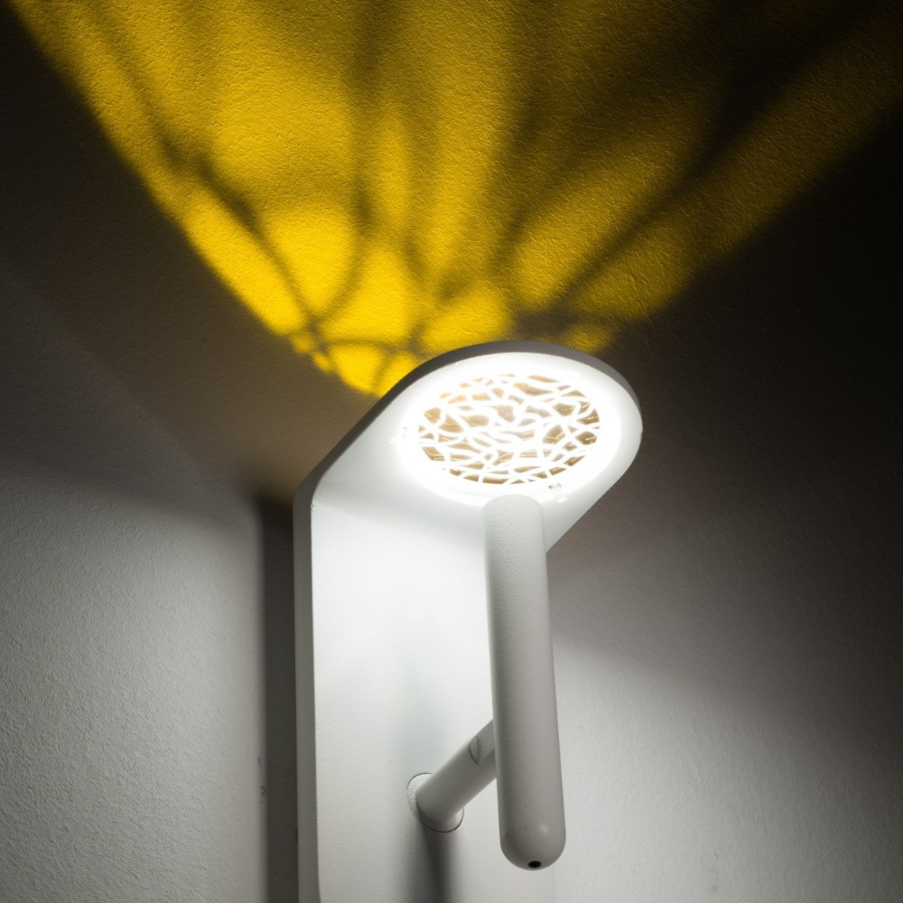 La sorgente luminosa LED integrata è ospitata in un cilindro orientabile in alluminio con diffusore in policarbonato trasparente. Questo permette di dirigere la luce con precisione e, grazie alla possibilità di utilizzare filtri colorati o gobo decorativi, crea suggestivi giochi di luce su pareti, richiamando elementi naturali come acqua, fuoco o rami. Con una temperatura di colore di 3000K (luce bianca calda) e una luminosità di 363 lumen, questa applique garantisce un'atmosfera accogliente e confortevole. La sua efficienza energetica è assicurata da un modulo LED da 4W con driver incluso.