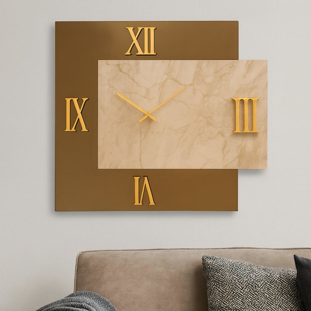 Capace di fondere stile e precisione in un'unica presenza scenica, questo orologio da parete quadrato conquista al primo sguardo grazie al suo aspetto ricercato. La superficie a specchio bronzato riflette delicatamente l'ambiente, contribuendo a creare giochi di luce e profondità visiva. Il pannello in laminato con effetto marmo dalle tonalità calde aggiunge un elemento materico dal forte impatto estetico. I numeri romani scolpiti nel legno e decorati in oro impreziosiscono la composizione, evocando un'eleganza classica ma attuale. Le sottili lancette dorate, realizzate in alluminio, scorrono silenziose grazie al preciso movimento al quarzo. Perfetto per ambienti raffinati come ingressi scenografici, studi professionali o zone living dal gusto sofisticato.