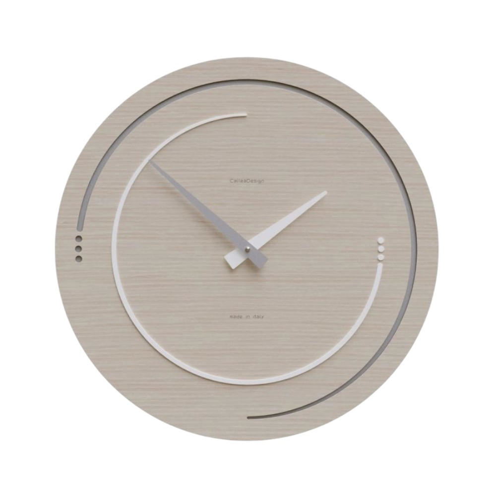 Orologio da parete dal design minimalista, caratterizzato da una combinazione elegante di rovere sbiancato, bianco e alluminio. Questo orologio Made in Italy ha una forma rotonda con un diametro di 46 cm ed è realizzato in legno MDF di alta qualità, con una finitura che esalta le venature del legno in tonalità chiara. Il design sobrio e raffinato è arricchito da linee fluide e curve concentriche, che definiscono il passare del tempo in modo stilizzato e moderno. Le lancette in metallo, di colore bianco, spiccano sul quadrante chiaro, garantendo una lettura precisa e facile. Il meccanismo al quarzo, silenzioso e preciso, è alimentato da una batteria AA (inclusa). L'orologio è dotato di un sistema di montaggio semplice con vite e tassello inclusi, che ne facilita l'installazione.