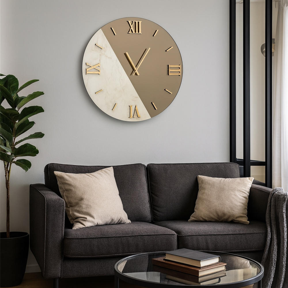 Grande orologio moderno rotondo da parete specchio bronzo marmo laminato 80cm