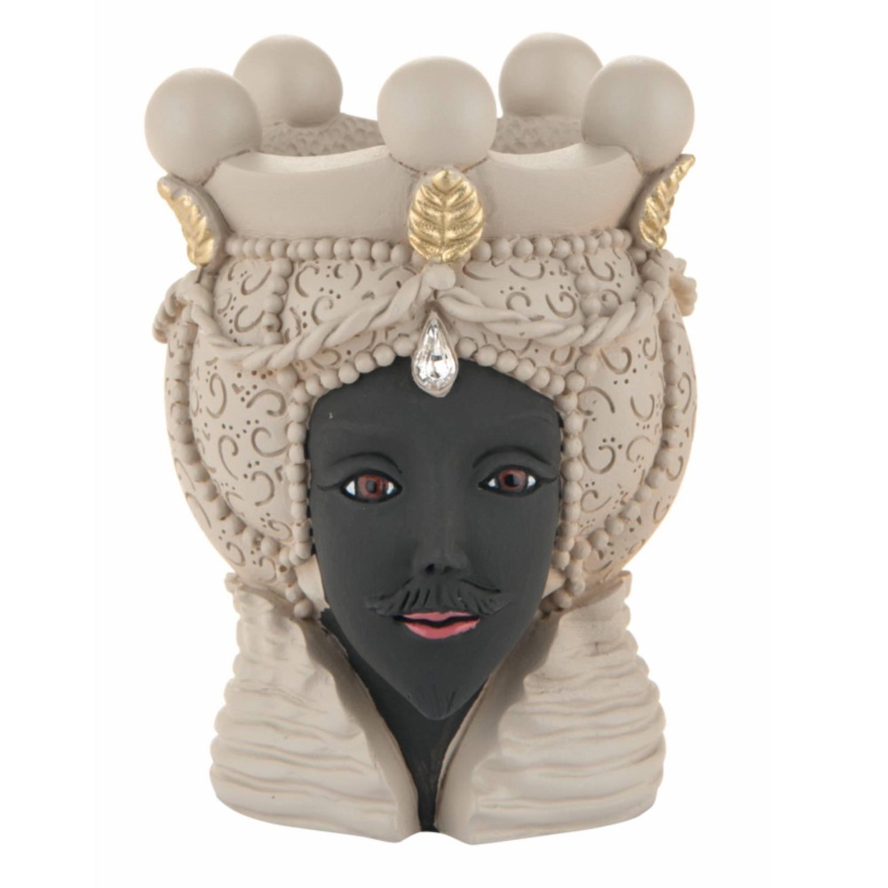 Elegante e ricca di significato, questa testa di moro maschile è un autentico omaggio alla tradizione siciliana reinterpretata in chiave moderna. Il copricapo color nocciola, ornato da foglioline dorate e da un cristallo brillante, incornicia con stile il volto del moro, conferendo luminosità e prestigio alla scultura. Realizzata in marmorino e rifinita con maestria artigianale, è perfetta come vaso per fiori finti o come prezioso soprammobile da esporre in soggiorno o salotto. Interamente prodotta in Italia, questa creazione rappresenta una sintesi perfetta tra cultura, design e qualità, valorizzando ogni ambiente con un tocco di storia e raffinatezza.