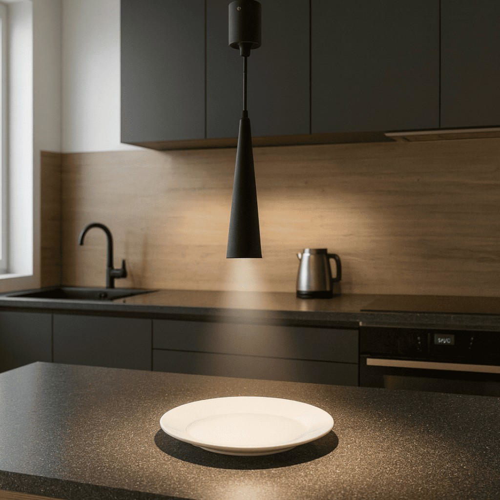 Lampada a sospensione per isola cucina ondaluce so noa cono nero luce diretta