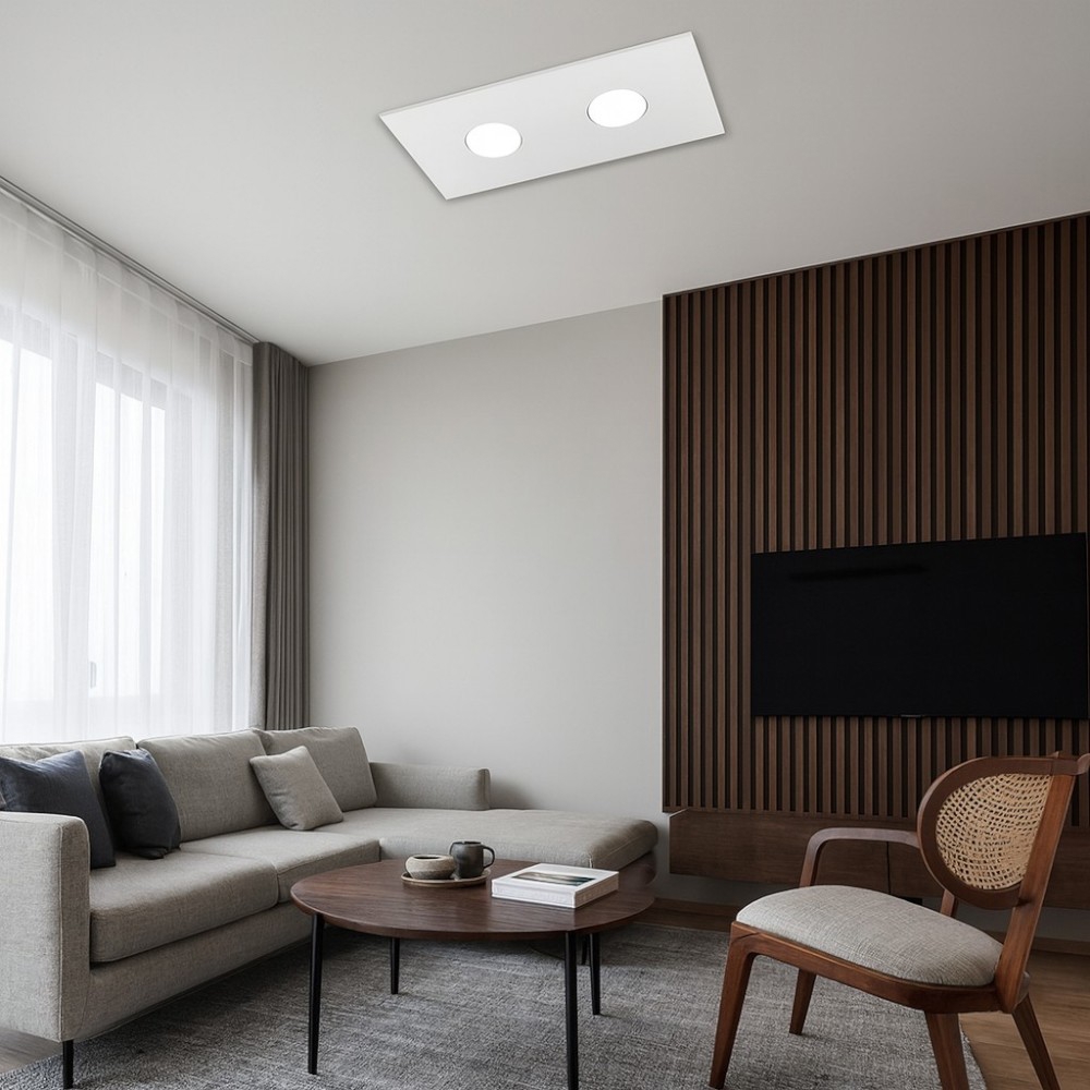 Plafoniera LED da soffitto della serie Area di Top Light, con un design minimalista e un profilo ultrasottile, ideale per cucine e tavoli da pranzo moderni. La struttura rettangolare in lastre di metallo verniciato bianco si integra con eleganza negli spazi contemporanei, offrendo un’illuminazione diretta e funzionale per valorizzare il piano del tavolo o l’intera cucina. Questa plafoniera è dotata di due luci orientate verso il basso, perfette per creare un’illuminazione uniforme e ben definita. Compatibile con lampadine GX53 fino a 12W (non incluse), permette un’installazione semplice tramite tasselli e viti, assicurando praticità e versatilità d’uso. Utilizzabile singolarmente o abbinata ad altri elementi della collezione per una configurazione coordinata, dona uno stile moderno e raffinato agli spazi dedicati ai pasti quotidiani.