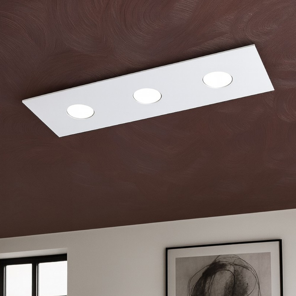 Plafoniera da cucina moderna della serie Area di Top Light, dal design minimalista e ultrasottile, ideale per illuminare con stile ed efficienza ambienti contemporanei. Realizzata interamente in metallo verniciato bianco, questa plafoniera rettangolare a 3 luci dirette verso il basso garantisce un’illuminazione uniforme e funzionale, perfetta per piani di lavoro e zone operative della cucina.